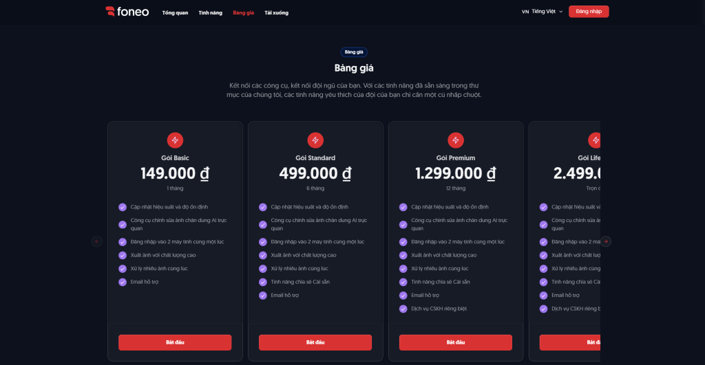- Bảng giá (tất cả gói đều có cập nhật hiệu suất, xuất ảnh chất lượng cao, xử lý hàng loạt, hỗ trợ email):