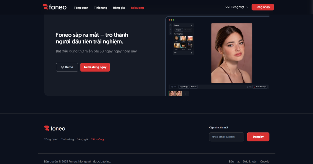 | Đăng ký nhận tin | Có (phần “Become the first to experience” + nút “Download Foneo App” để lại email) |