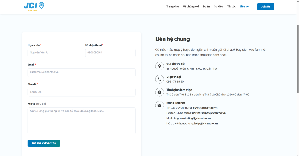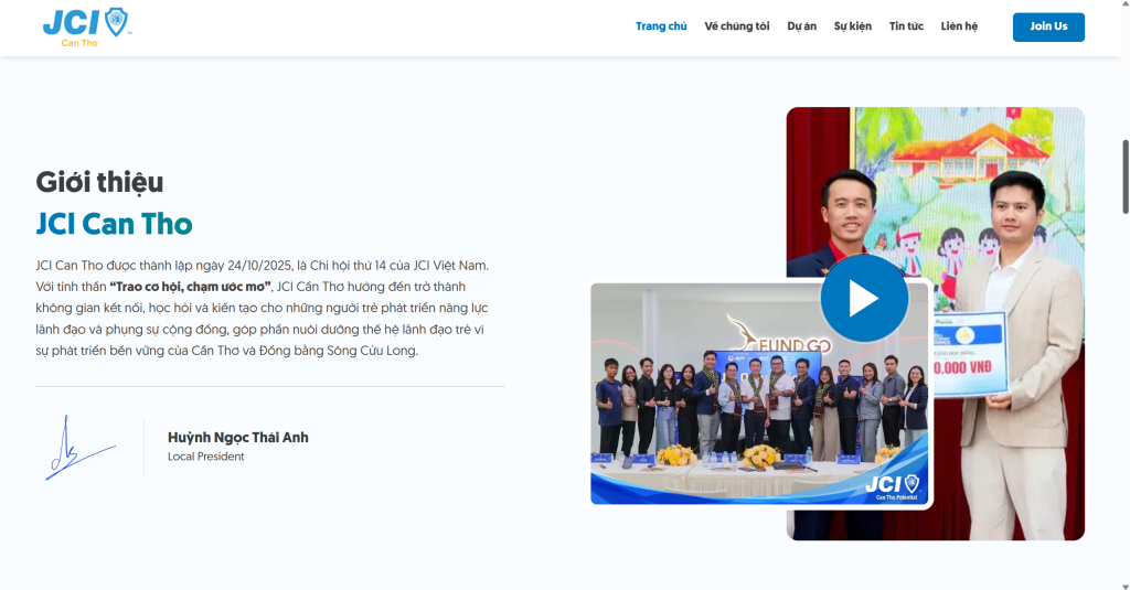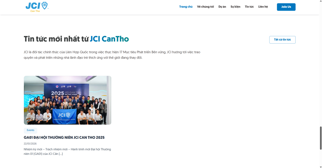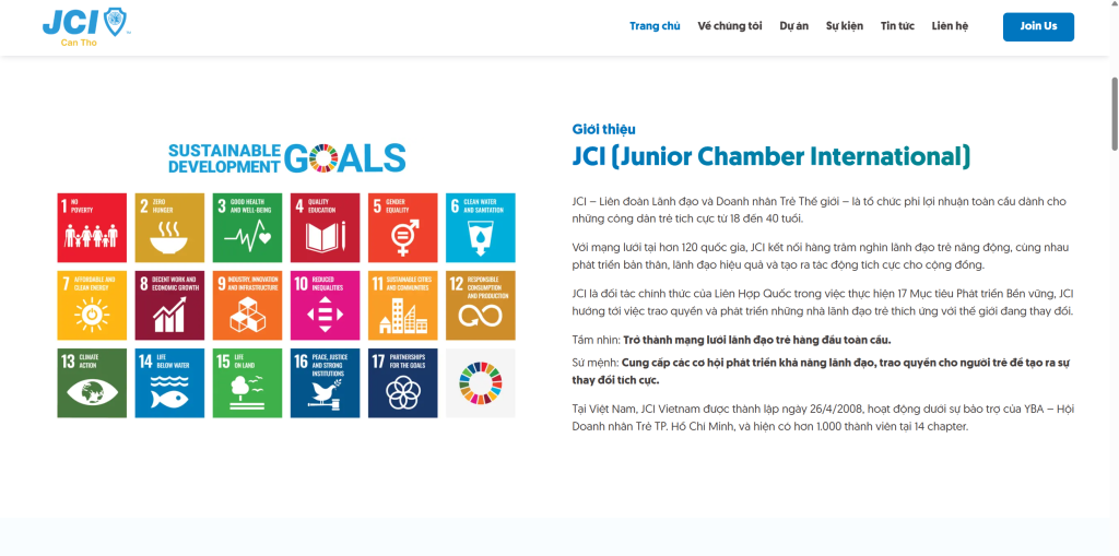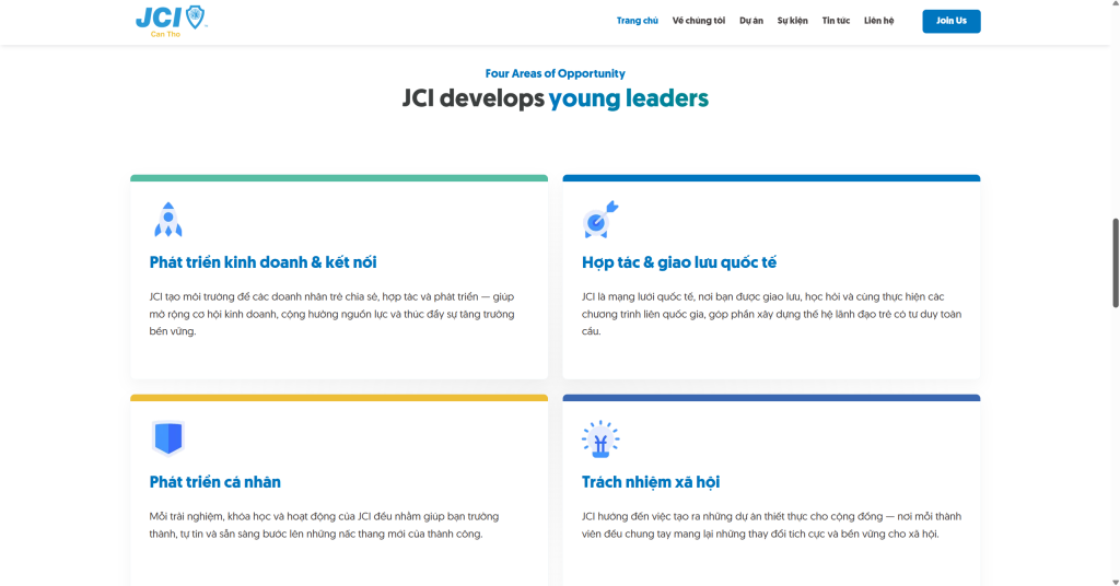 Chi hội trực thuộc JCI Việt Nam, kết nối lãnh đạo trẻ từ 18-40 tuổi tại Cần Thơ và Đồng bằng Sông Cửu Long, phát triển kỹ năng lãnh đạo, kinh doanh và thực hiện các dự án cộng đồng.Website cung cấp thông tin hoạt động, dự án cộng đồng và chương trình đào tạo của JCI Cần Thơ.