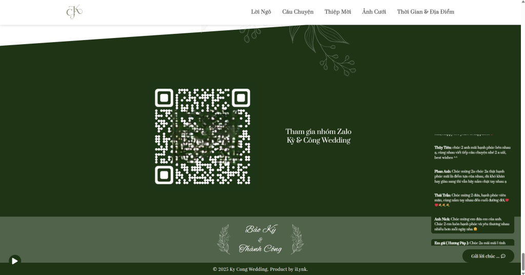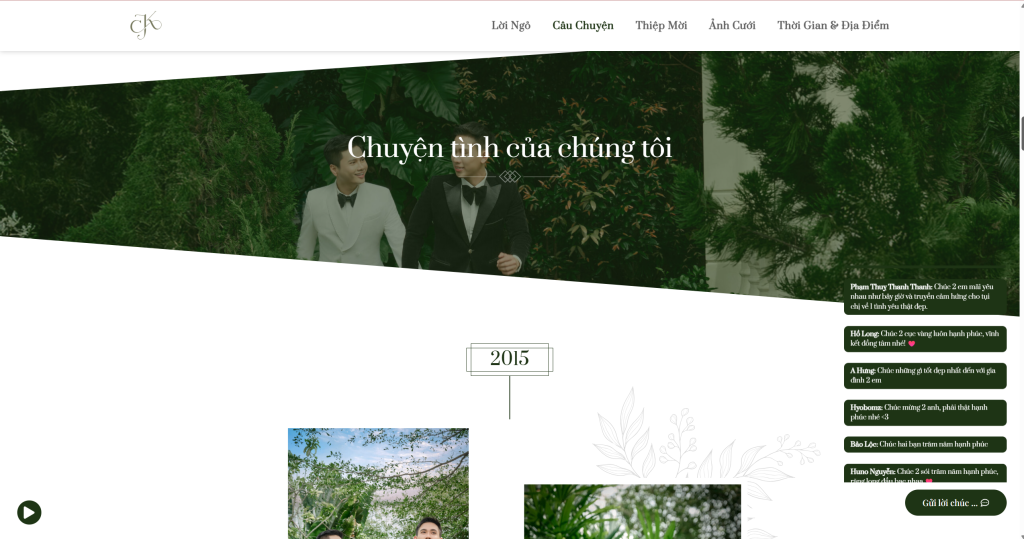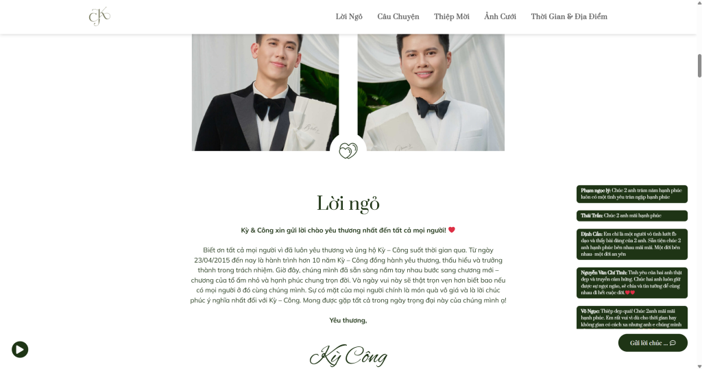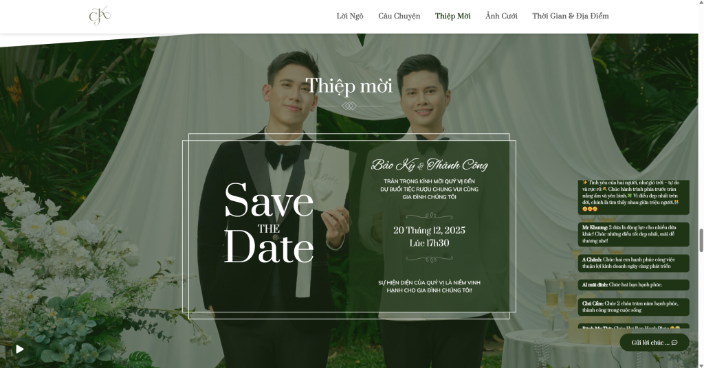 Đây là một website thiệp cưới (wedding invitation website) được tạo ra để thông báo và mời khách đến dự đám cưới của Bảo Kỳ và Thành Công. Trang web bao gồm lời ngỏ, dòng thời gian tình yêu kéo dài từ 2015 đến 2025 (với những cột mốc quan trọng: ngày hẹn hò đầu tiên, vượt qua khó khăn, cột mốc “come out”, và ngày cưới), thông tin chi tiết về địa điểm, thời gian tổ chức, album ảnh cưới, và đặc biệt là một mục bình luận dài với hàng trăm lời chúc phúc từ bạn bè, người thân.